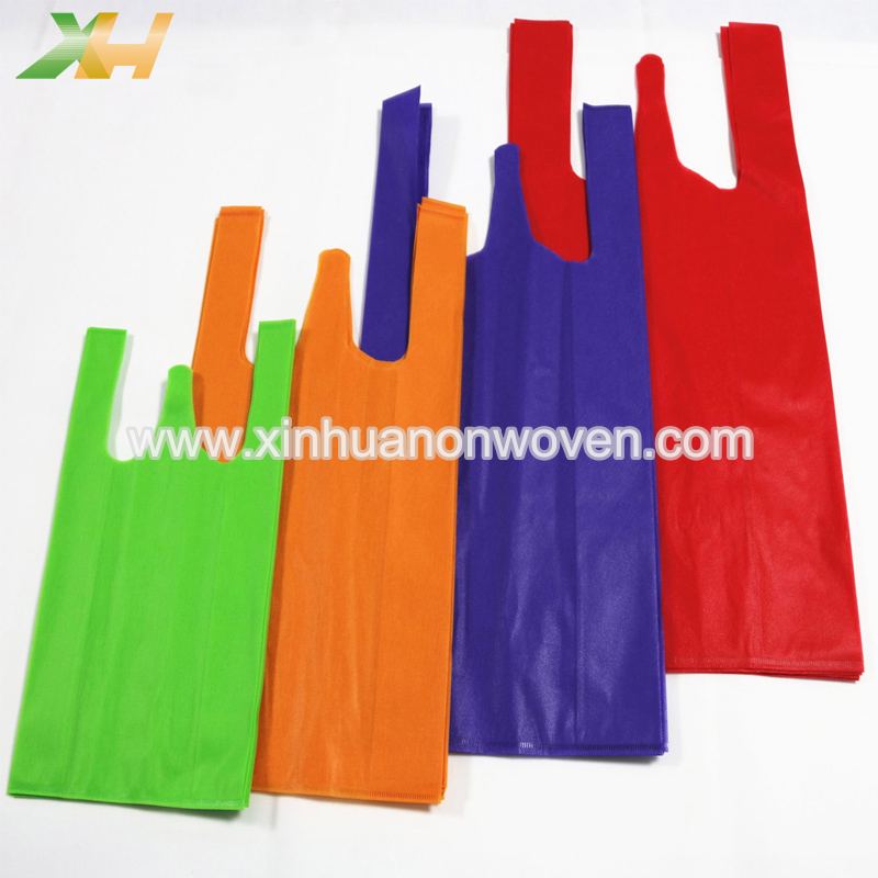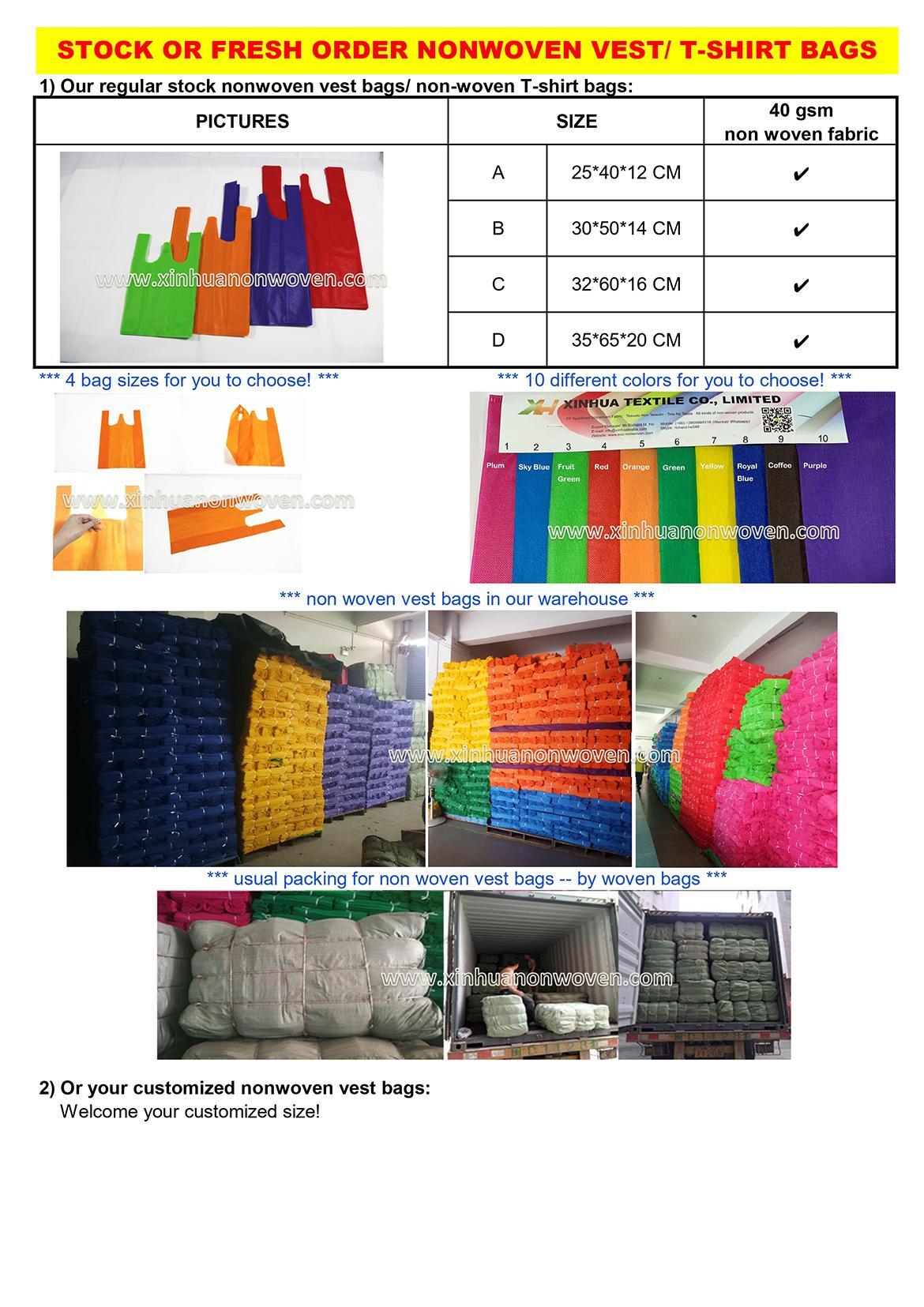 Currently, our factory, XINHUA TEXTILE, could supply and produce ecofriendly non-woven t shirt bag in various colors.